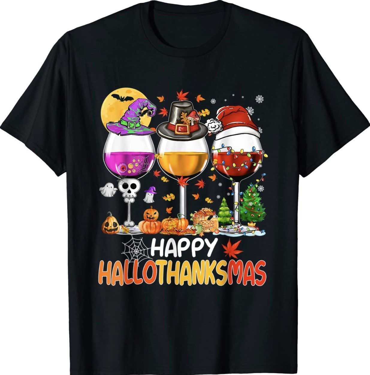 Happy Hallothanksmas Wine Glasses Witch Santa Hat Pumpkin Shirt