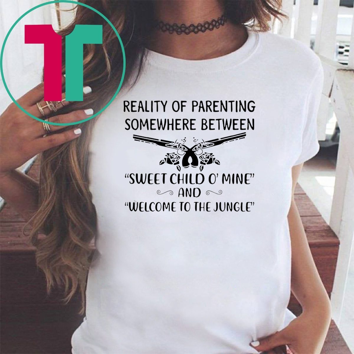 Reality of parenting somewhere between sweet child o’mine shirt